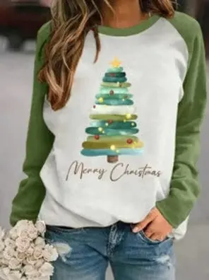 Women's Christmas Tree & Letter Printed Raglan Sleeve Crew Neck T-Shirt L