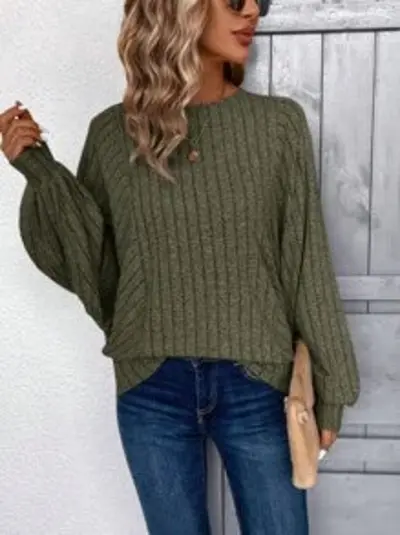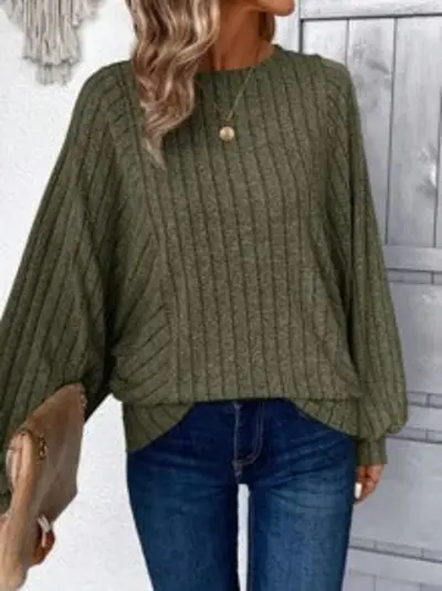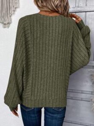 Apricot Loose Rib Knit Long Sleeve Sweatshirt For Women