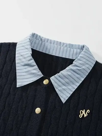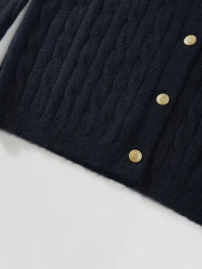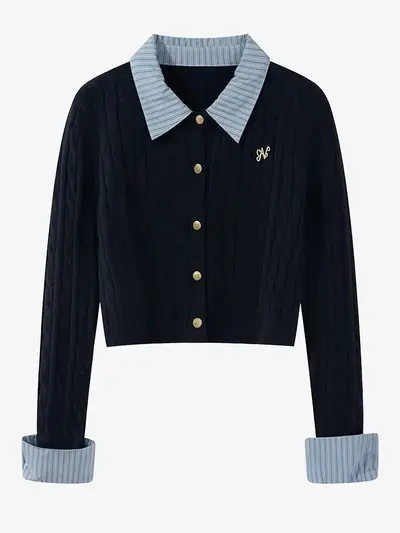 Women's Chic Navy Blue Knit Cardigan with Collar and Button Detail