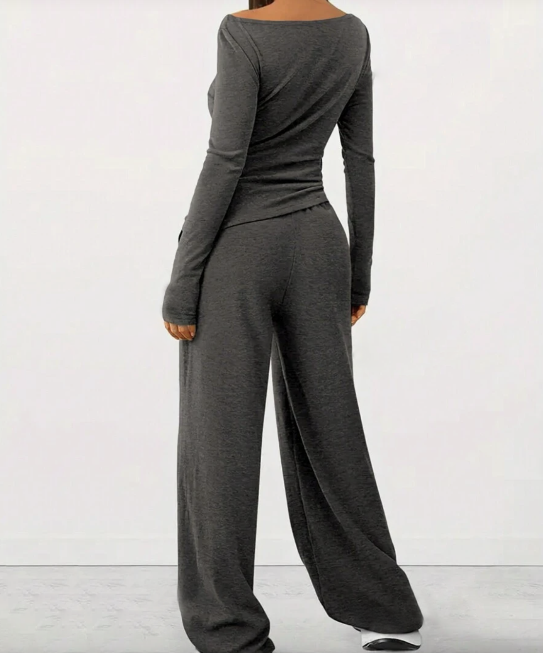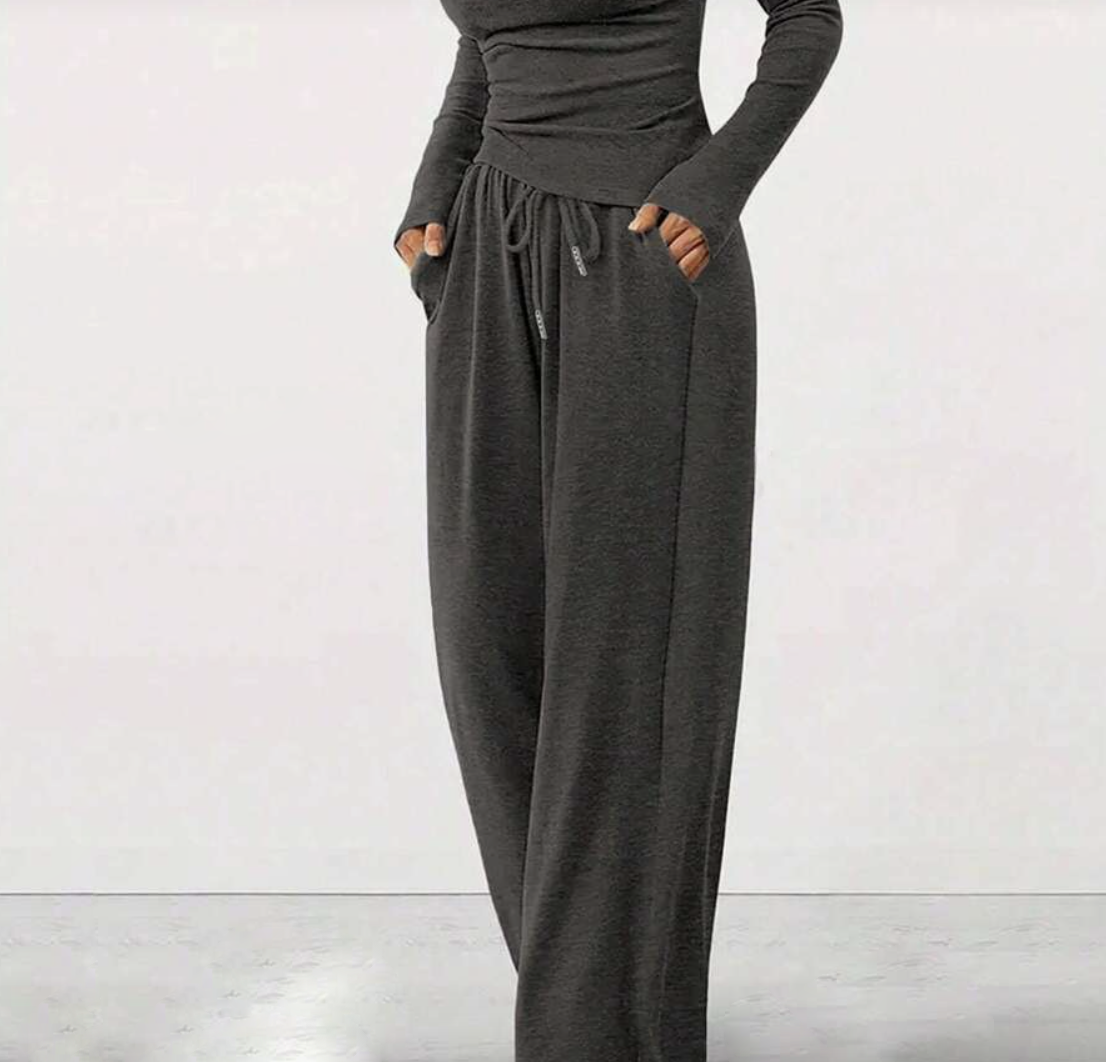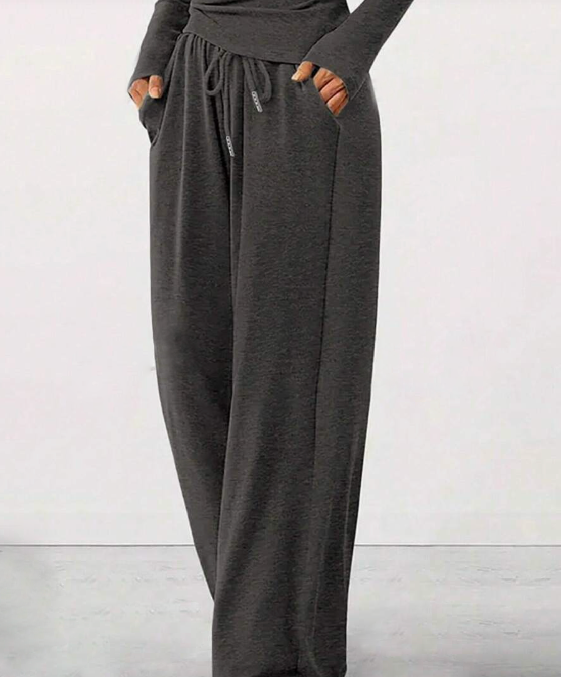 Women's Solid Color Crew Neck Long Sleeve T-Shirt And Waist Tie Pants Casual Suit, Spring & Autumn